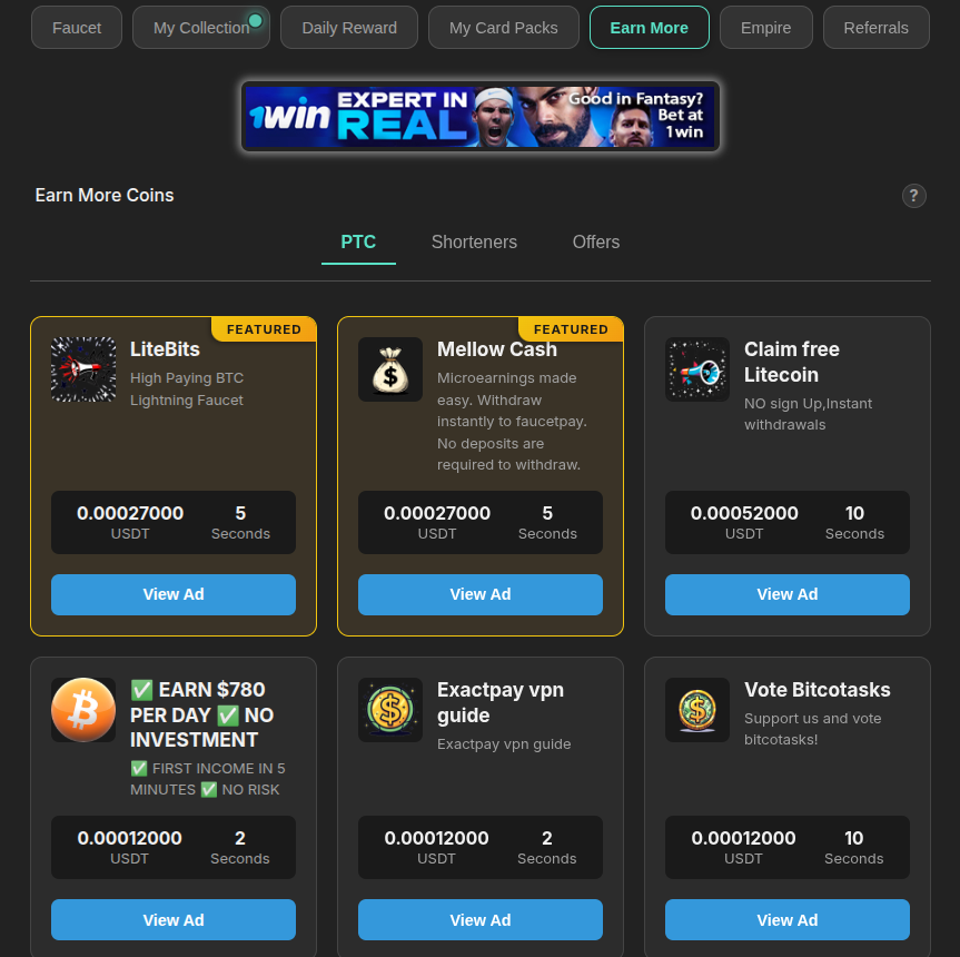 Por supuesto, dado que este sitio es sobre PTC, Dream Faucet tiene un aspecto fuerte de PTC en «Earn More (Gana Más)», donde puedes ver anuncios y ganar más Satoshi para tu cuenta.