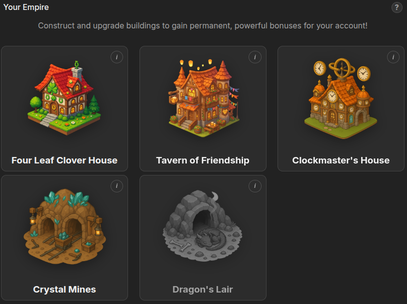 Tu imperio consiste de 5 construcciones diferentes, cada una mejora un aspecto del juego: