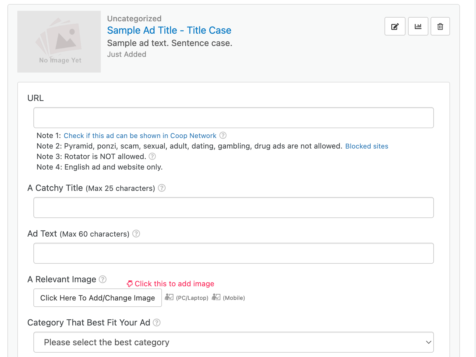 El proceso para tener un anuncio Pro funcionando es muy sencillo. Solo has click en «Add a new add»