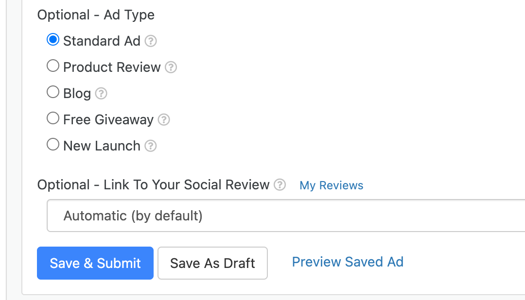 LeadsLeap permite escribir opiniones sobre diversos productos o sistemas. Si estas anunciando algo sobre lo que ya escribiste una opinión personal en LeadsLeap, con la opción de «Vínculo a tu revisión social» (Link To Your Social Review) te permite elegir algo que ya hayas escrito. Revisiones sociales es otra gran característica de LeadsLeap que planeo cubrir pronto.