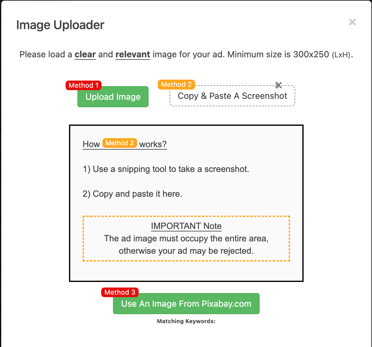 Y ahora puedes agregar una imagen a tu anuncio. Puedes subir una imagen de 300×250. Al subir obtienes algunas opciones para ajustar la imágen.